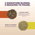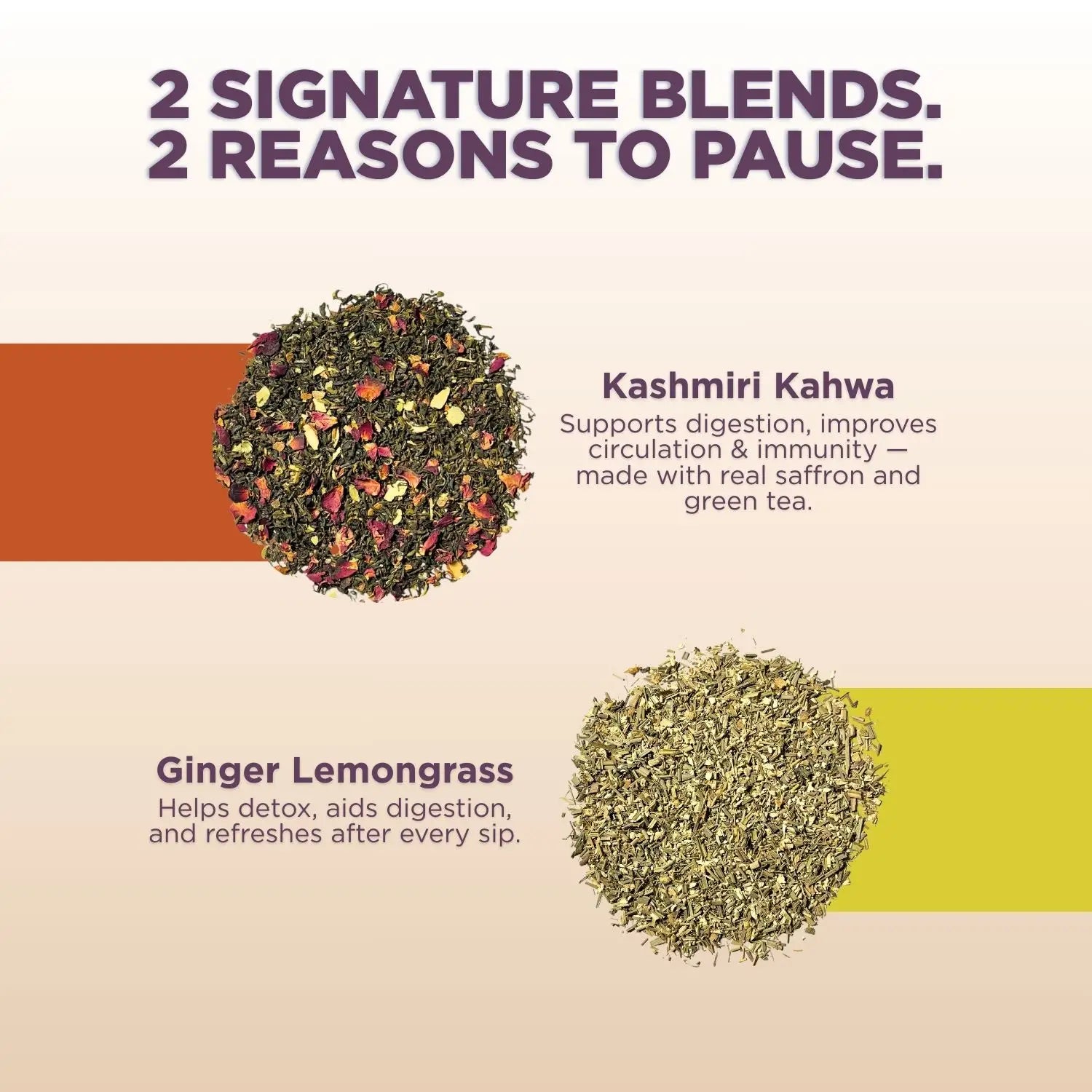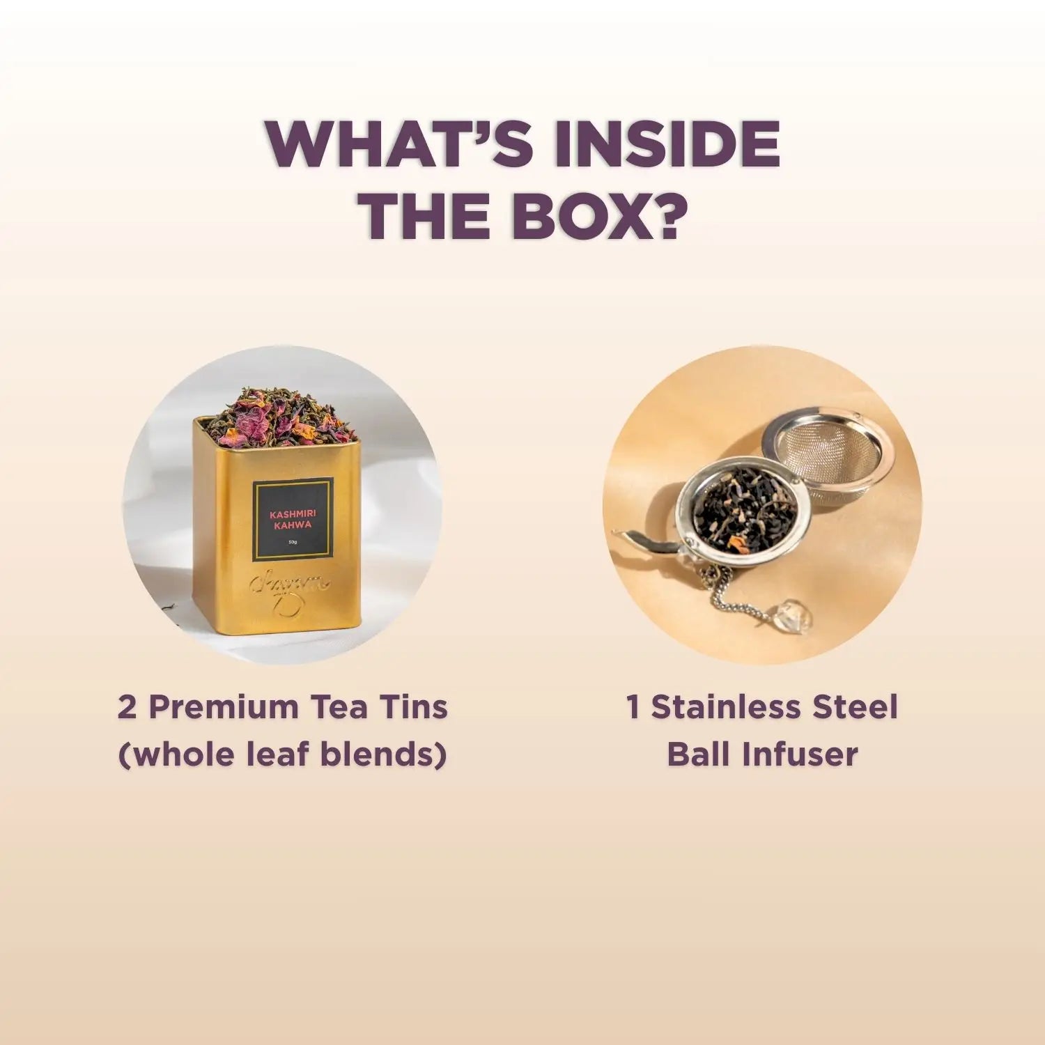 - Kashmiri Kahwa Tea (50g tin) - Ginger Lemongrass Tea (50g tin) - 1 stainless steel round infuser - Elegant gift-ready box