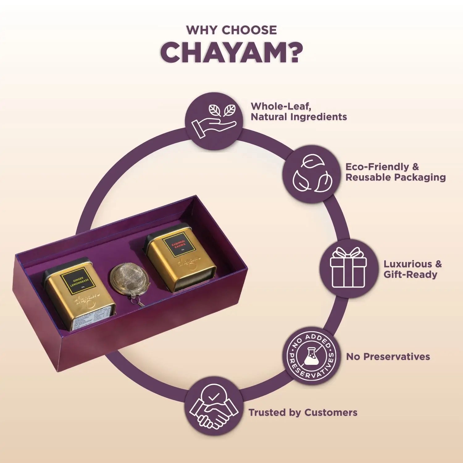The Blissful Infusion Gift Box by Chayam Tea is crafted for moments of care and calm. Featuring Kashmiri Kahwa and Ginger Lemongrass teas with a premium stainless-steel infuser, it makes brewing simple and thoughtful. A meaningful choice for weddings, anniversaries, or festive occasions, this gift reflects wellness and warmth in every detail. More than a present, it shows you value the health and happiness of the ones you love.