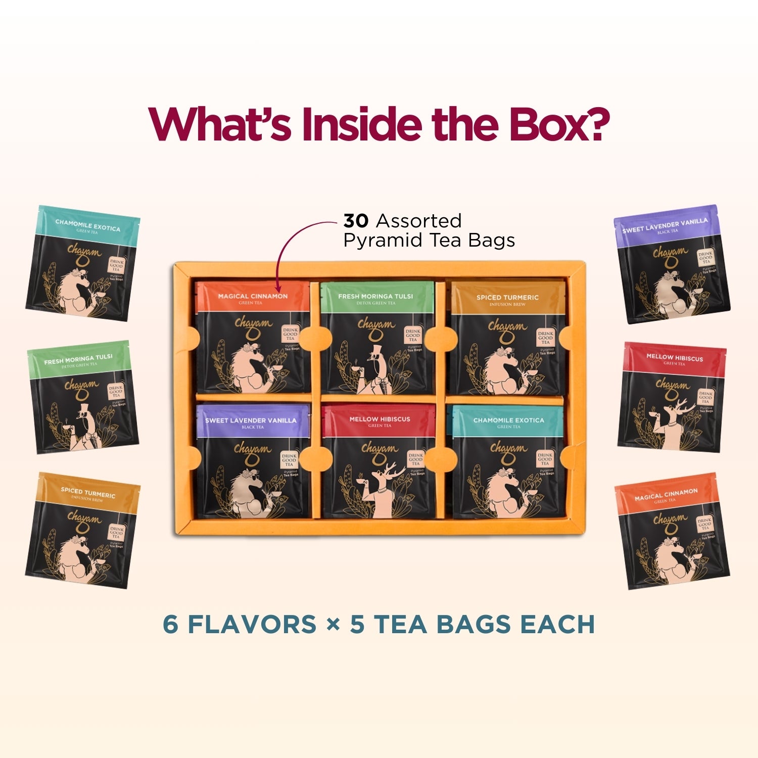 30 Premium Pyramid Tea Bags - 6 Flavors × 5 Bags Each (Green, Black & Herbal blends)- Individually sealed for long-lasting freshness - Compact, stylish, gift-ready packaging