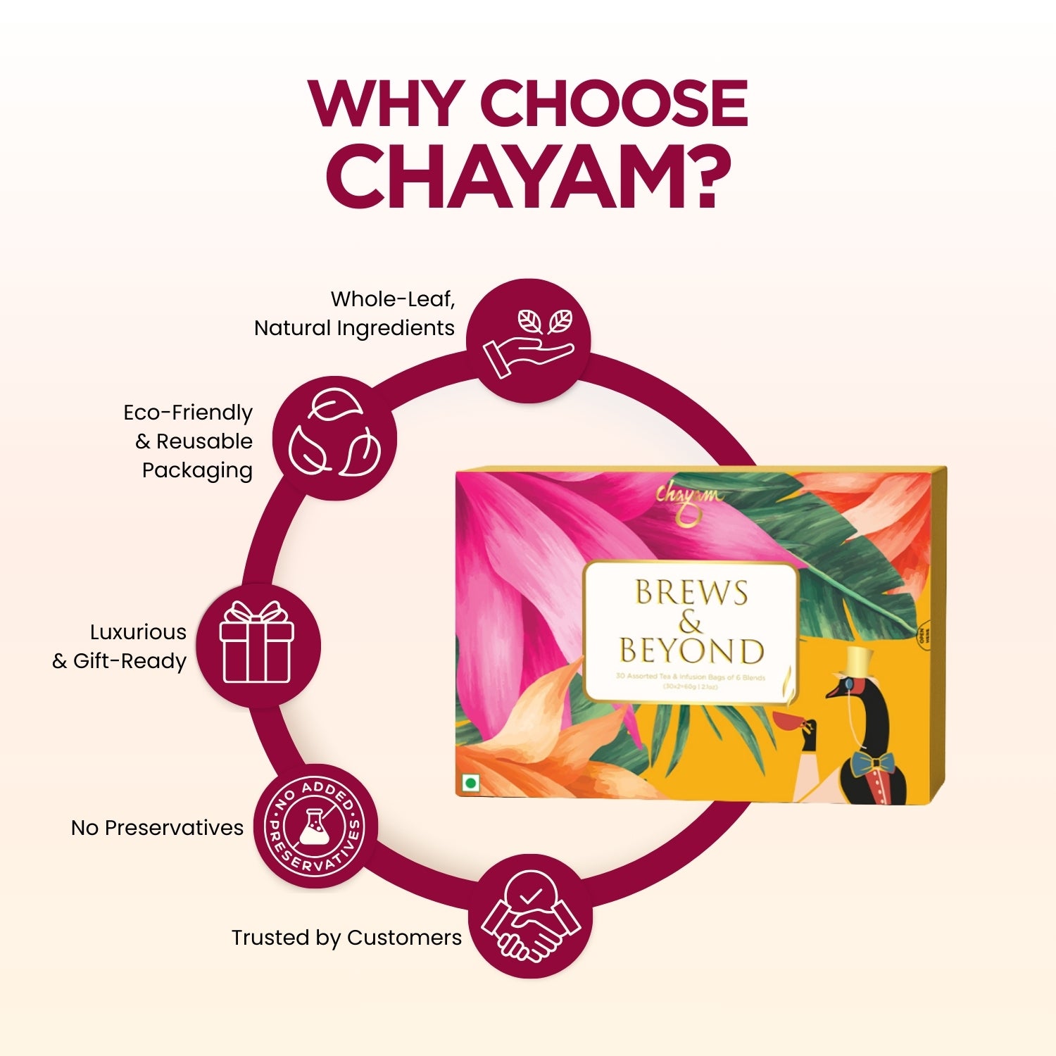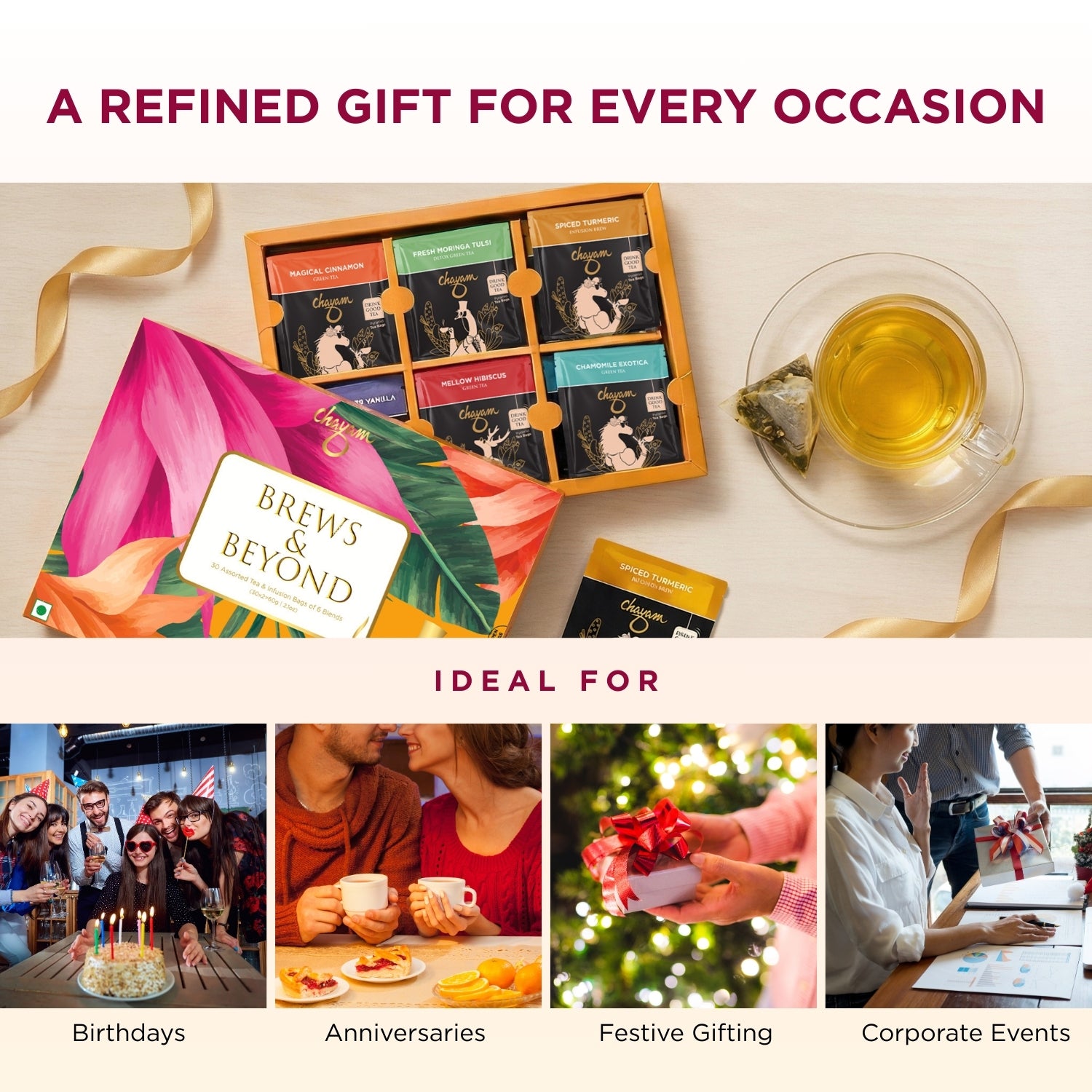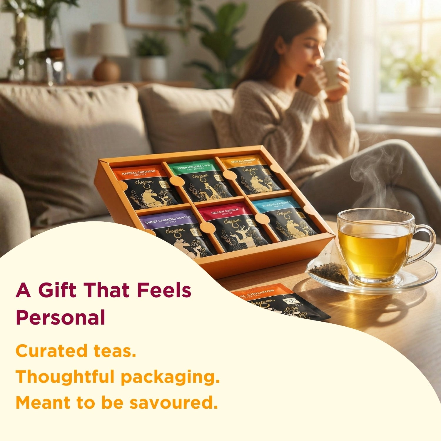 Discover a complete tea journey in one elegant box. Chayam’s Brews & Beyond Assorted Tea Bags Gift Box includes 30 pyramid tea bags across 6 premium flavors — a balance of green, black, and herbal teas crafted to refresh mornings, energize afternoons, and calm evenings. Sealed for freshness and packed in a stylish, gift-ready box, it’s the perfect wellness gift for friends, family, or colleagues. Whether for everyday indulgence or festive celebrations, this assortment brings thoughtful variety and premium taste to every cup.