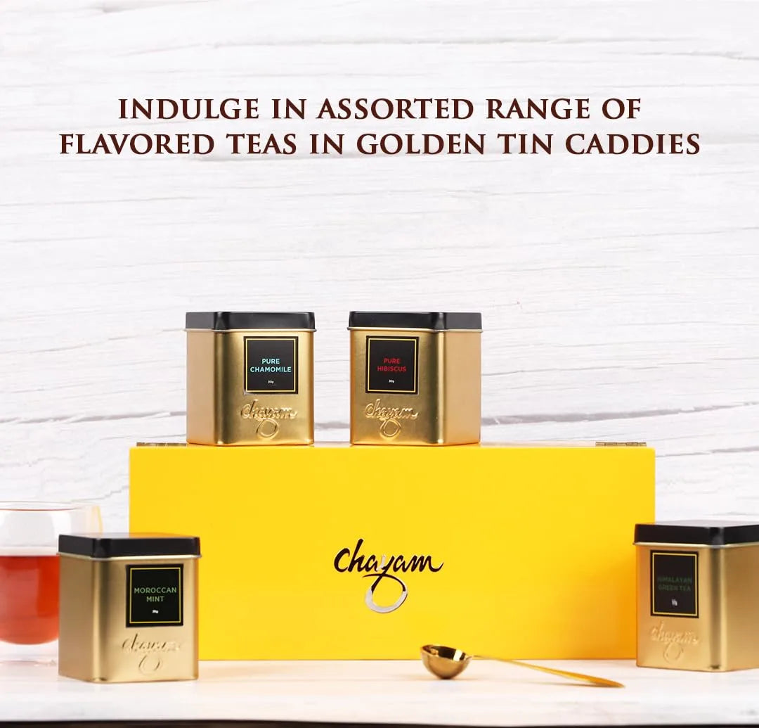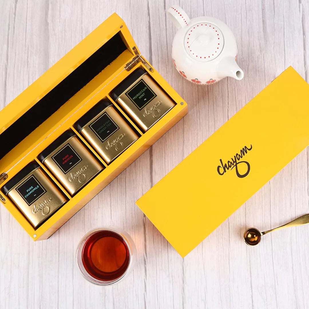 The Fine Tea Chest by Chayam Tea is designed as a luxury gift that blends elegance with wellness. Featuring four premium teas in reusable tins, presented inside a handcrafted wooden chest, it is the perfect choice for weddings, anniversaries, or corporate gifting. A gift that reflects sophistication and care, the Fine Tea Chest goes beyond ordinary hampers — offering both taste and timeless utility.