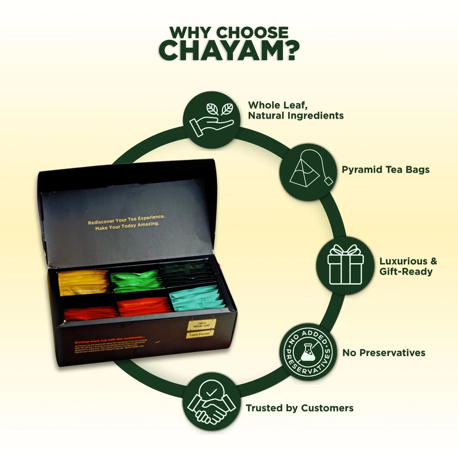 The Assorted Gift Box by Chayam Tea is a wellness-inspired hamper crafted for those who value health and variety. With 48 pyramid tea bags across six refreshing flavours, it offers the perfect balance of taste and convenience. An affordable yet meaningful choice for weddings, anniversaries, or corporate gifting, this box makes wellness both thoughtful and celebratory.