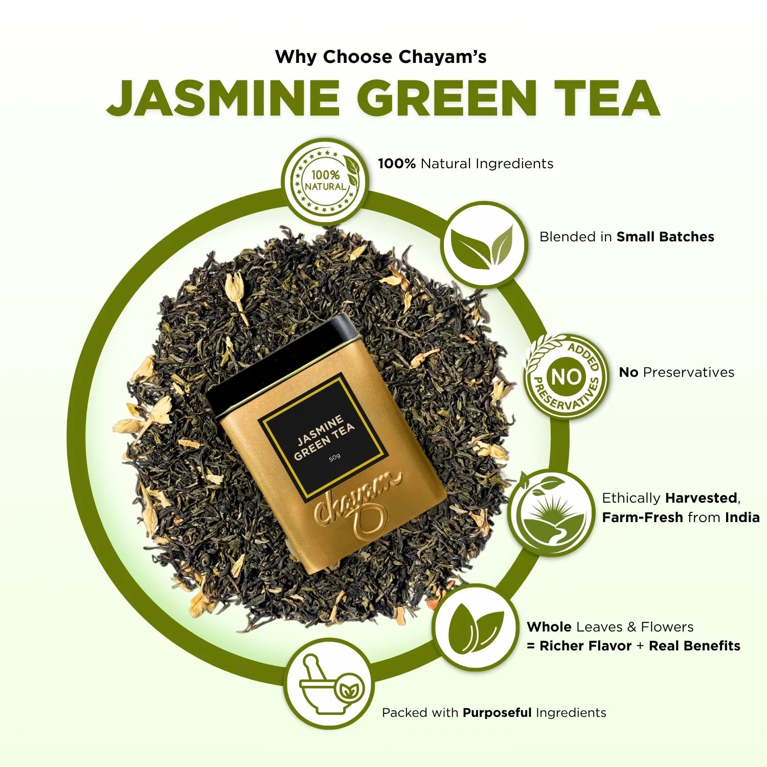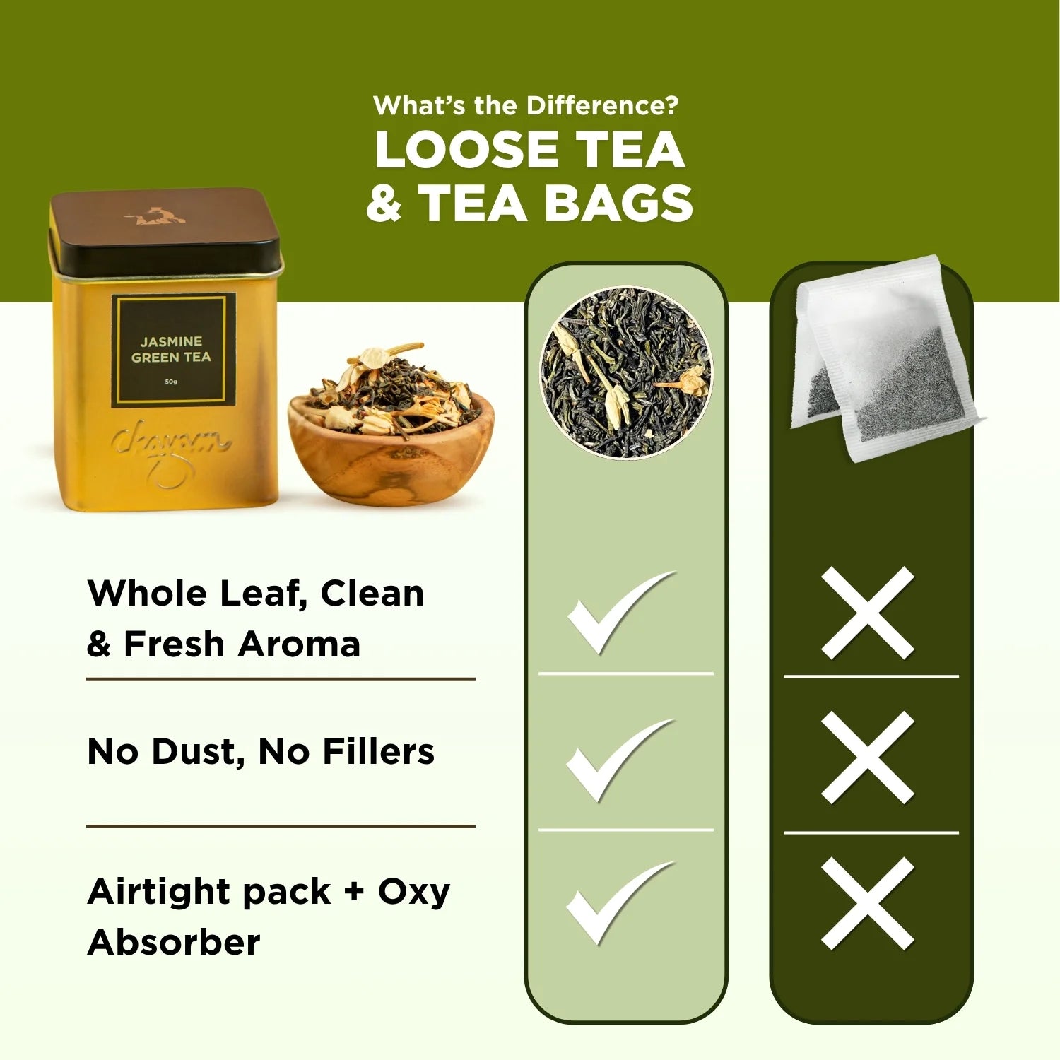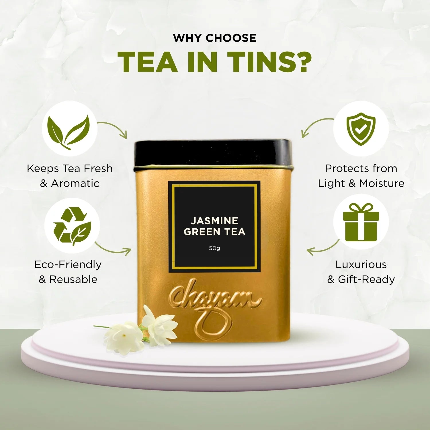 Elegantly presented in a 50g tin caddy, this Jasmine Green Tea delights with its soothing floral aroma and refreshing taste—ideal for peaceful tea moments or thoughtful gifting.