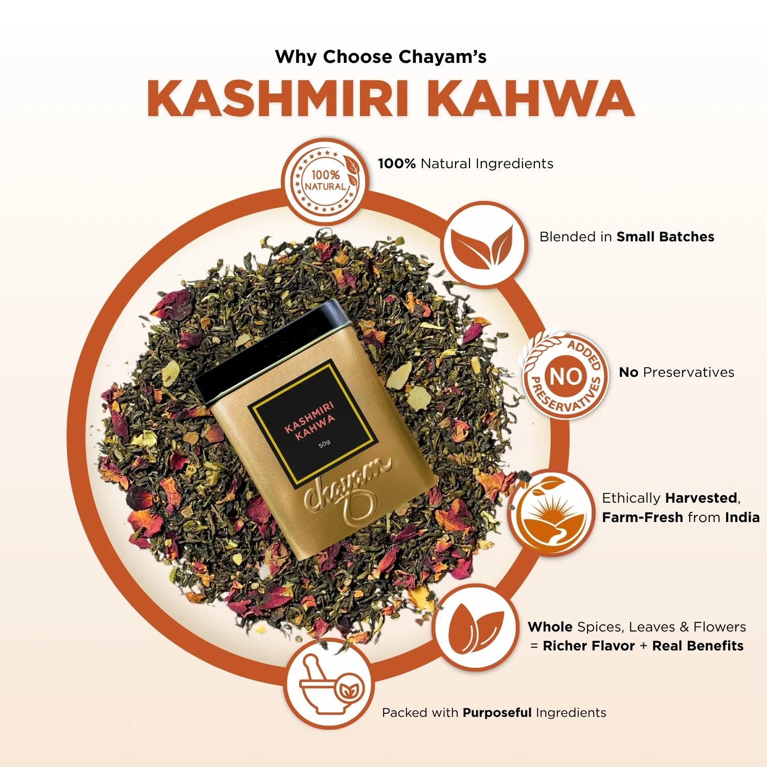 Experience the uplifting and complex flavor of authentic Kashmiri Kahwa. With notes of saffron, rose, and warm spices, this green tea is perfect as a soothing ritual.