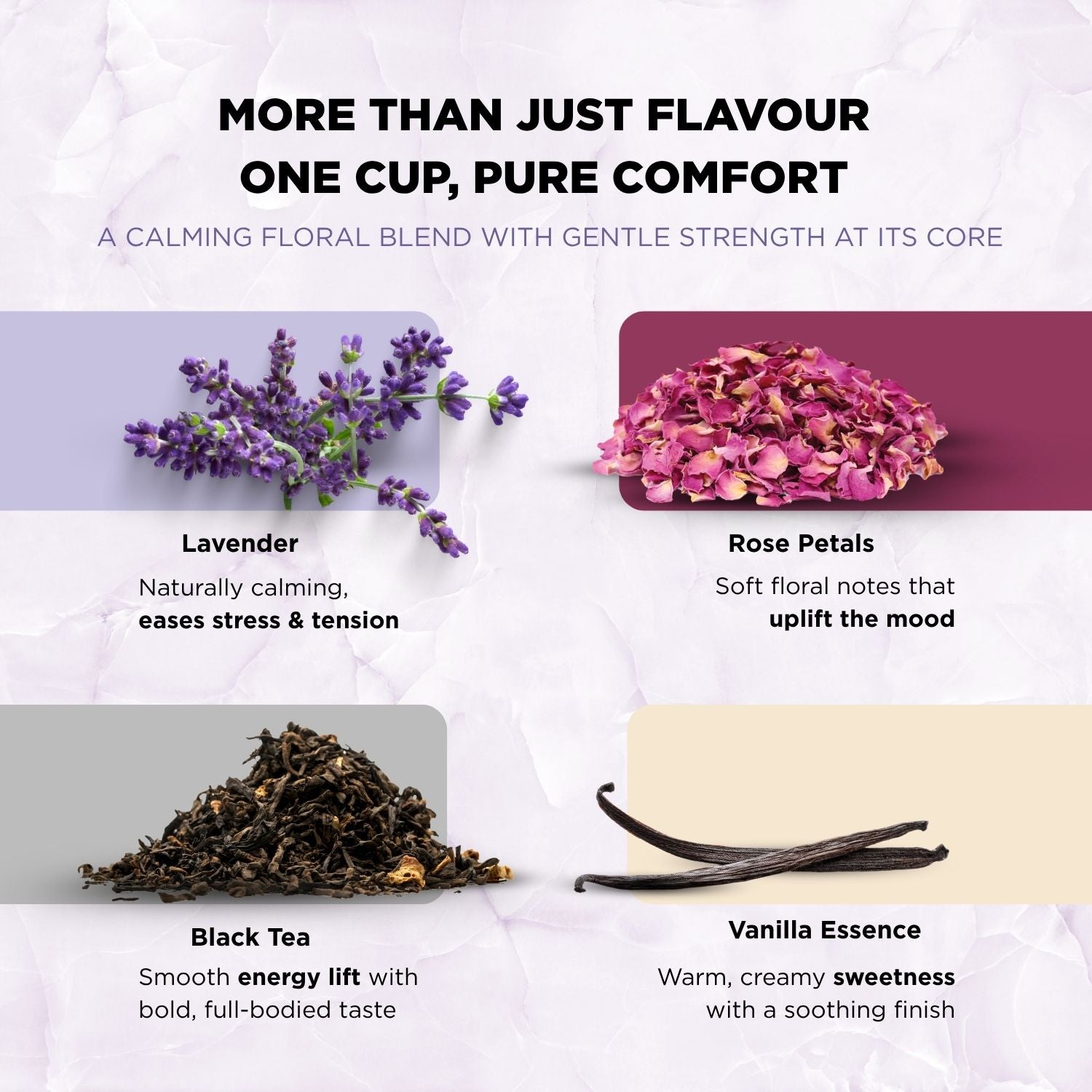 Unwind with Lavender Vanilla, a rich and aromatic blend with roasted chicory and rose petals, offering a soothing yet indulgent caffeine lift.