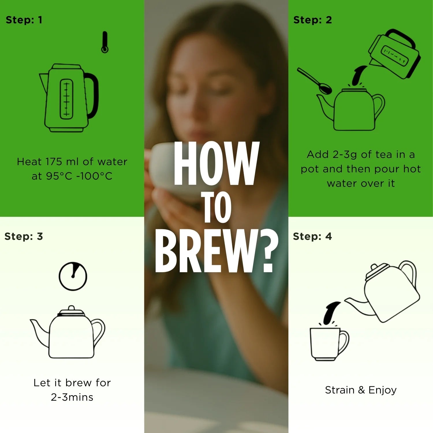 Heat 175 ml of water to 95-100°C. Add 2-3 grams of tea to a teapot and pour the hot water over it. Allow the tea to steep for 2-3 minutes. Strain and enjoy!