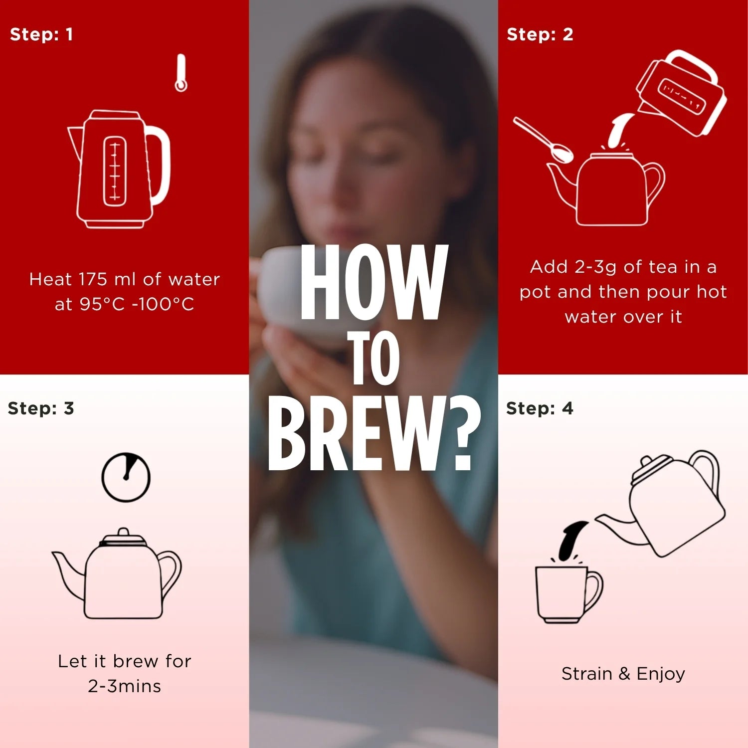 Heat 175 ml of water to 95-100°C. Add 2-3 grams of tea to a teapot and pour the hot water over it. Allow the tea to steep for 2-3 minutes. Strain and enjoy!