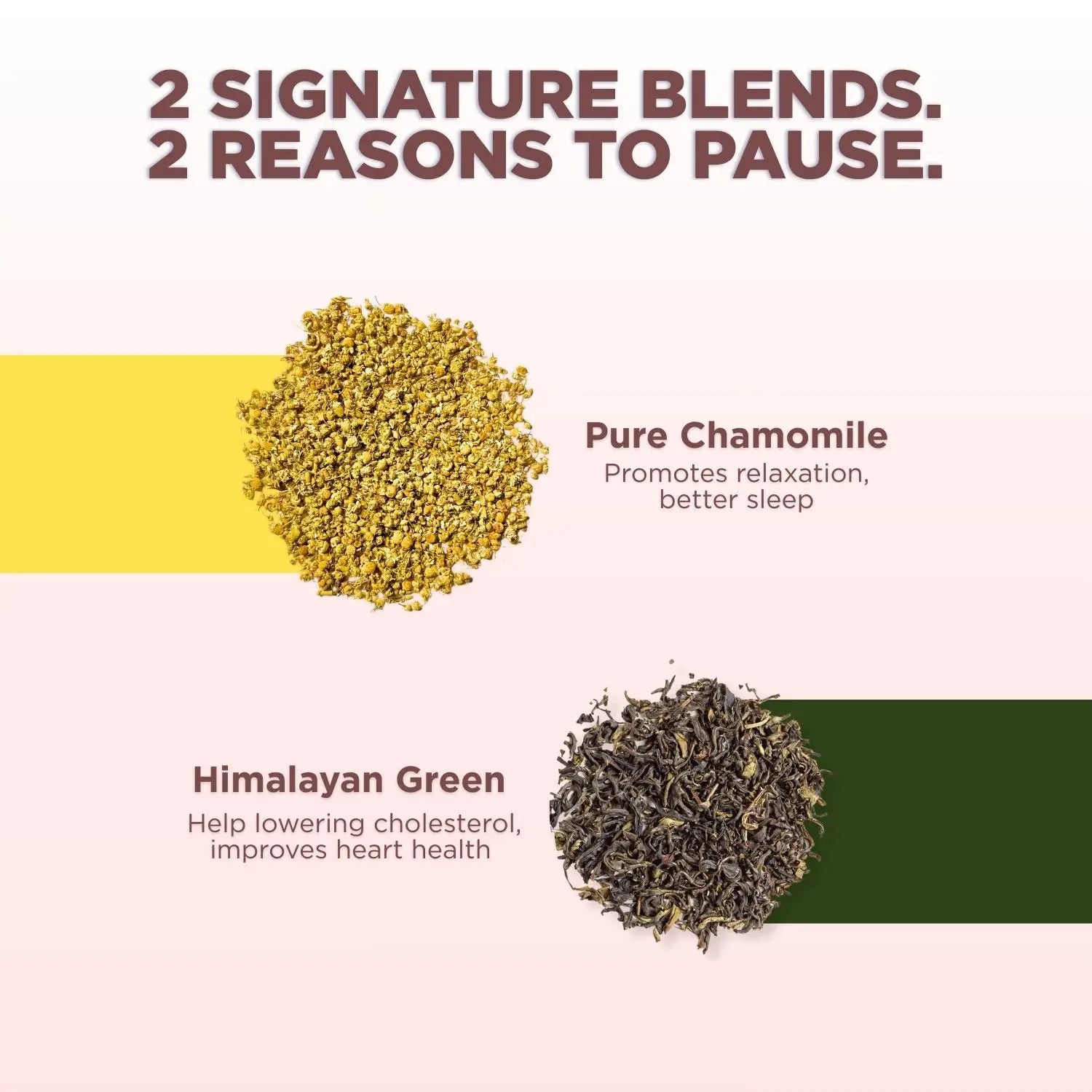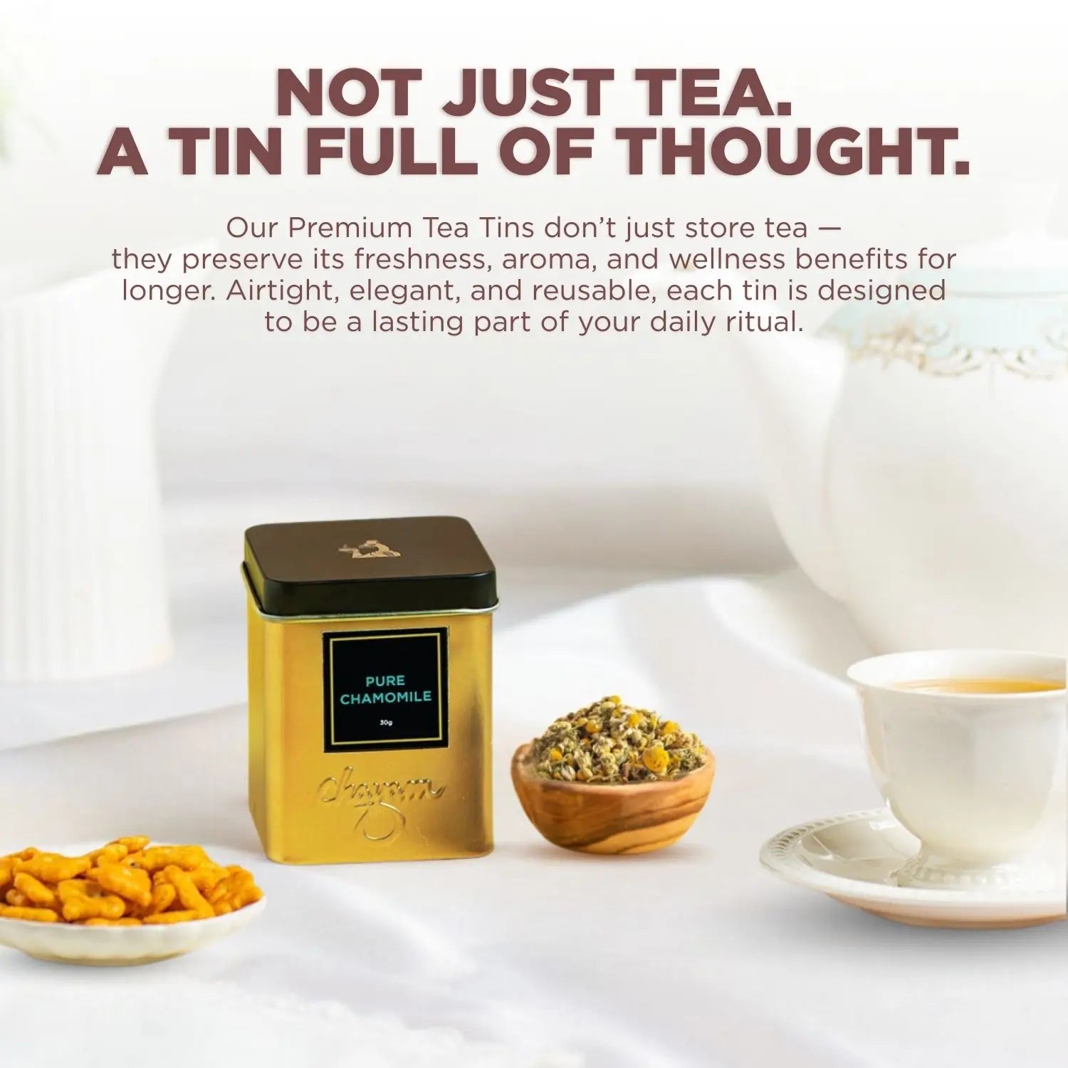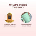 - Himalayan Green Tea (50g tin) - Chamomile Tea (30g tin) - 1 artisanal kulhad with 18-carat gold embossing - Premium gift box