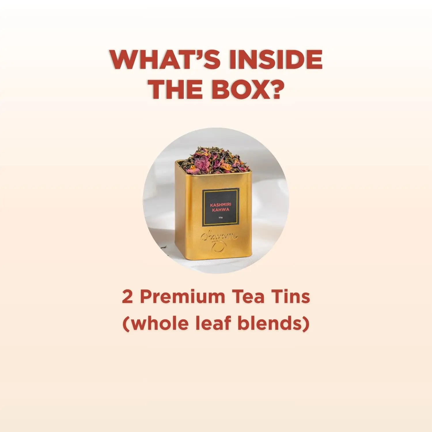 - Kashmiri Kahwa Tea (50g tin) - Lemon Ginger Tea (50g tin) - Handcrafted premium gift box
