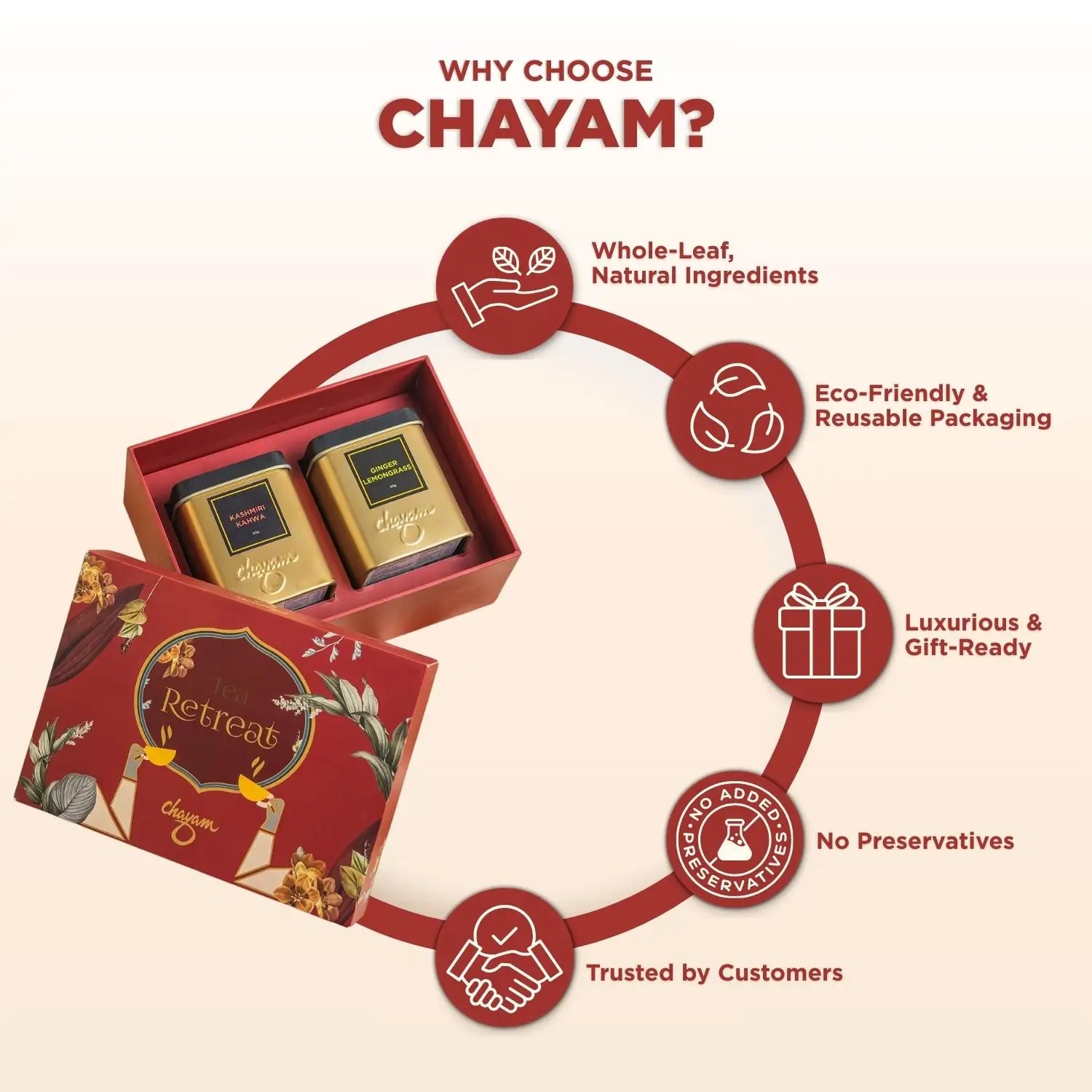 With the Tea Retreat Gift Box by Chayam Tea, gifting becomes a thoughtful gesture of wellness. Featuring Kashmiri Kahwa and Lemon Ginger teas in premium tins, it blends tradition with refreshment in every sip. Perfect for weddings, anniversaries, or corporate occasions, this hamper is a reminder that the best gifts are those that care for body and soul. A unique way to share warmth, health, and celebration in one elegant box.