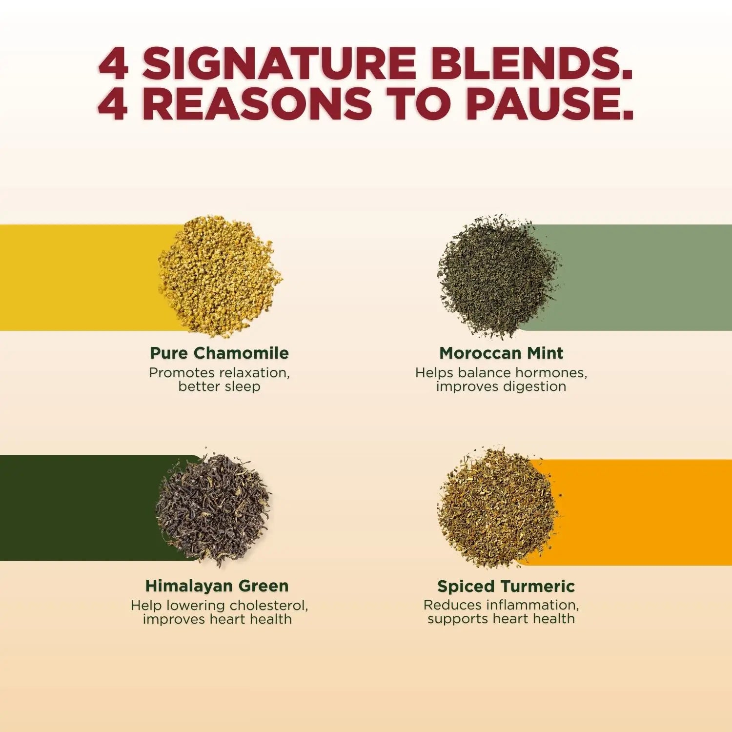 - Pure Chamomile Flowers (glass tube) - Spiced Turmeric Blend (glass tube) - Moroccan Mint Tea (glass tube) - Himalayan Green Tea (glass tube)
