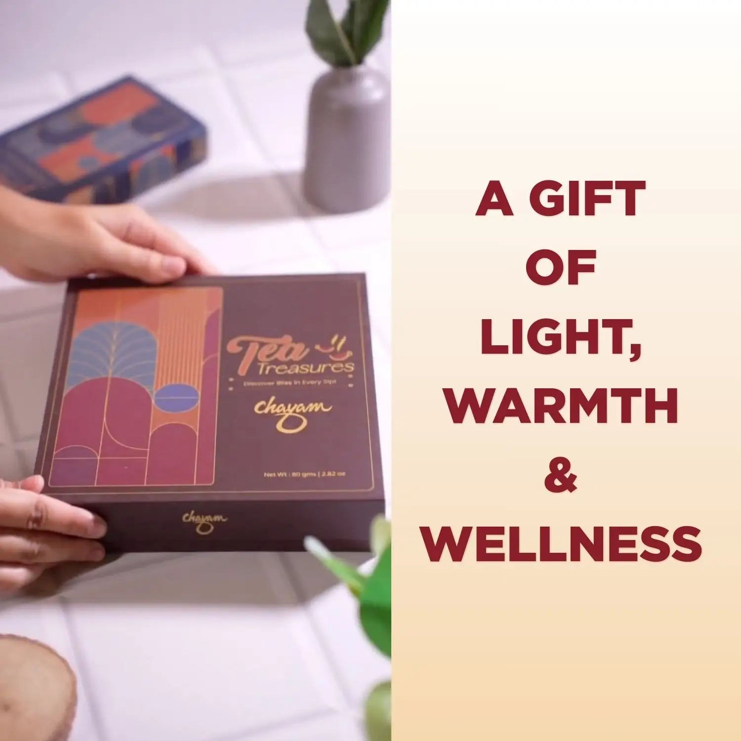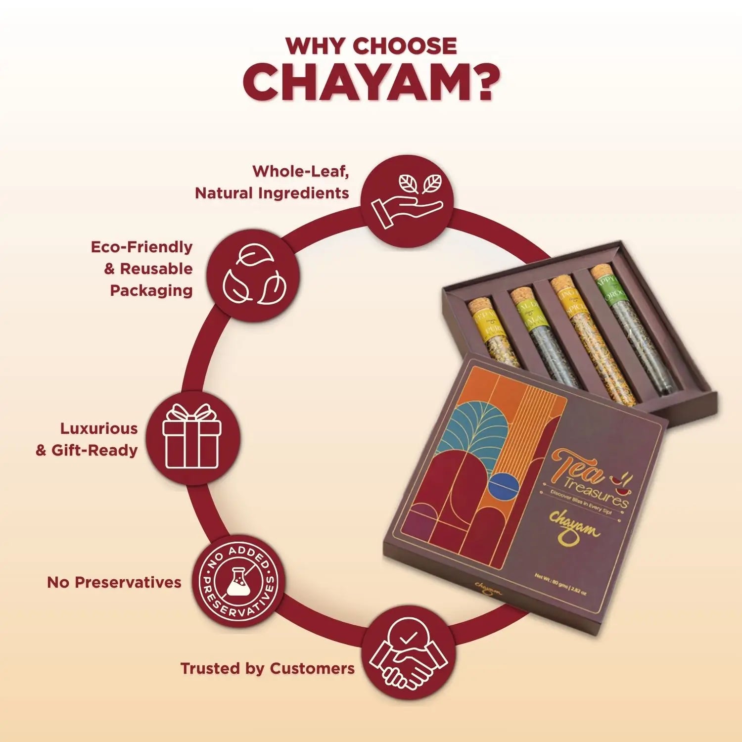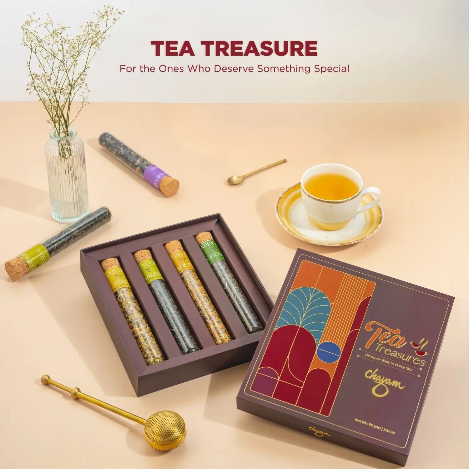 The ExoticΒ Tea Treasures Gift Box by Chayam Tea brings together four handpicked blends β Pure Chamomile Flowers, Spiced Turmeric, Moroccan Mint, and Himalayan Green Tea β presented in elegant glass tubes. Thoughtfully crafted for weddings, festive occasions, or corporate gifts, this set offers variety, wellness, and taste in one compact box.