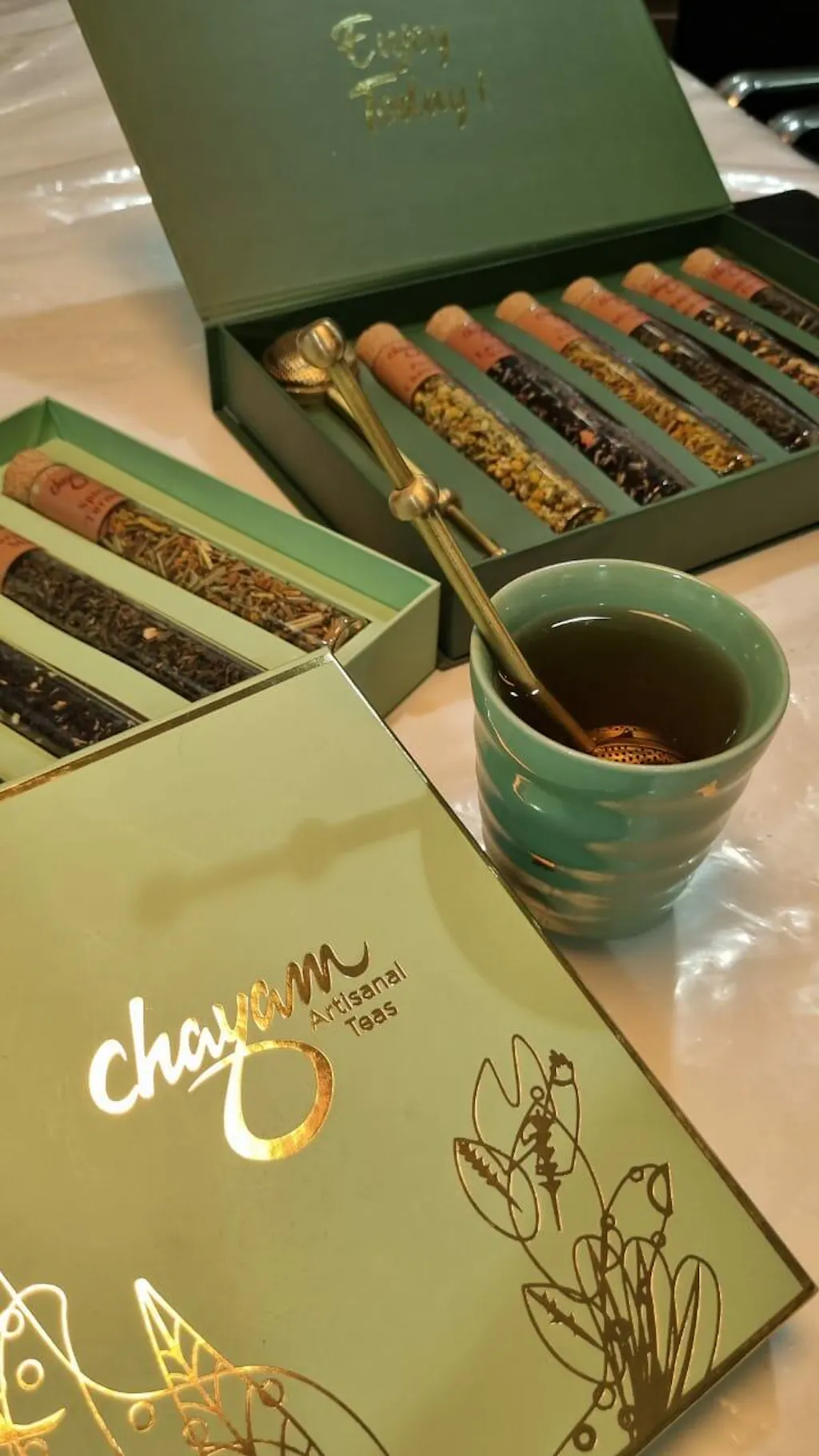 The ExoticΒ Tea Treasures Gift Box by Chayam Tea brings together four handpicked blends β Pure Chamomile Flowers, Spiced Turmeric, Moroccan Mint, and Himalayan Green Tea β presented in elegant glass tubes. Thoughtfully crafted for weddings, festive occasions, or corporate gifts, this set offers variety, wellness, and taste in one compact box.